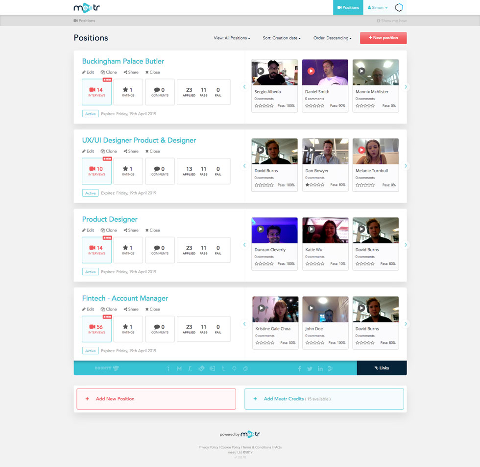 Meetr is a recruitment and applicant processing web app for SMEs. It posts jobs across multiple job boards and social sites with the click of a button, then automatically tests and interviews through video recording potential new recruits. It allows recruiters to easily filter, review and create notes about candidates. See more