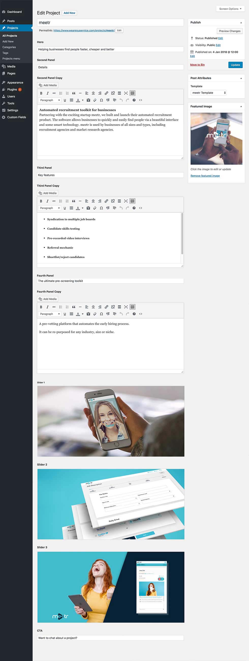 My role on this project was to design and develop the new site for the company, so that they could update content. As part of this project I set up a server on DigitalOcean managed with Virtualmin, a version control with Git and DeployHq.